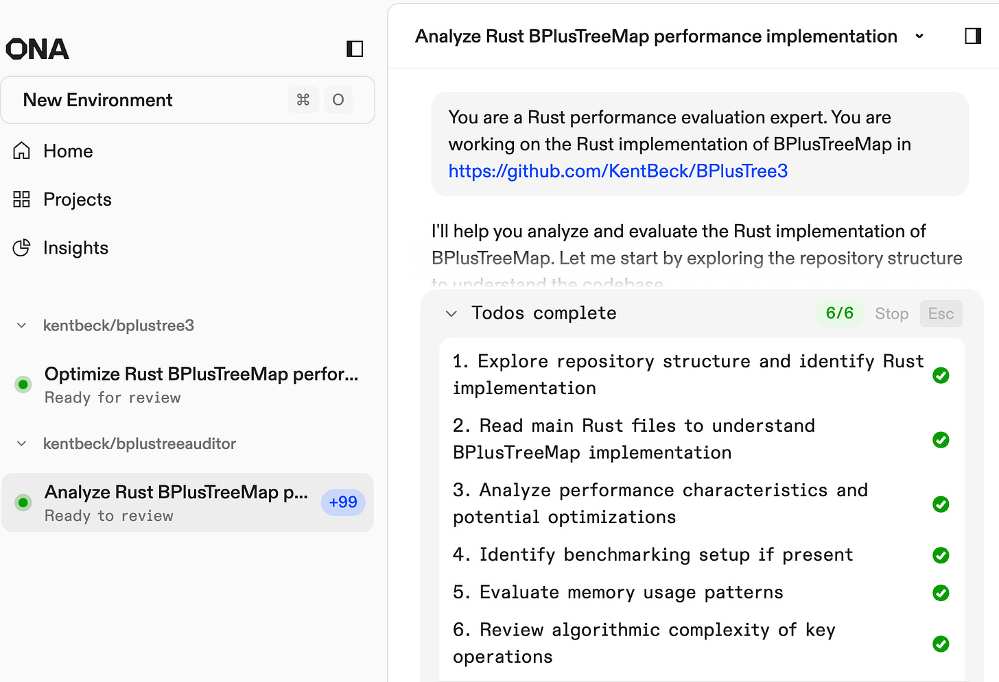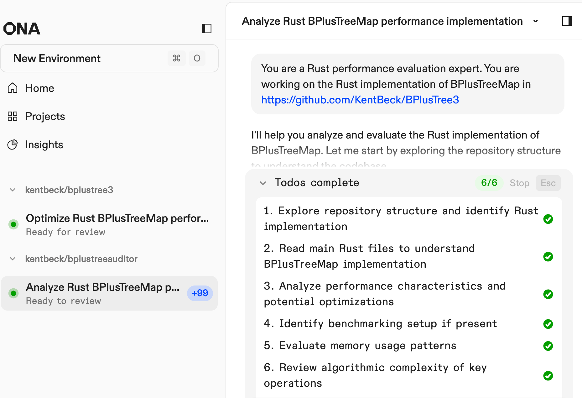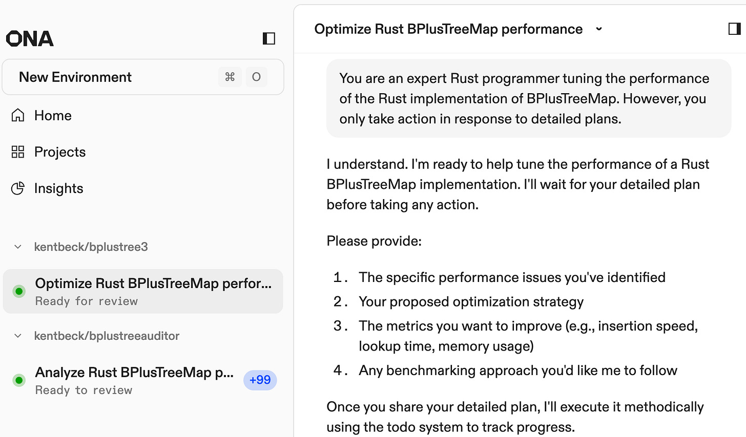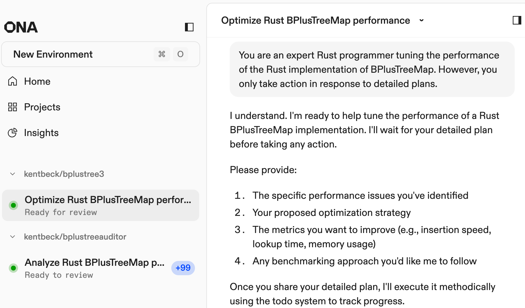 I was feeling pretty stuck. How can I get a reliable, honest answer to the question, “How does the B+ tree compare to the B tree?”? Fortunately, right about then I got access to Ona. My friends at (the former) GitPod have been creating isolated, private, secure development environments in the cloud. Now they were turning that expertise to augmented coding. It was easy to get multiple genies running without communicating directly. Maybe I could apply some game theory!